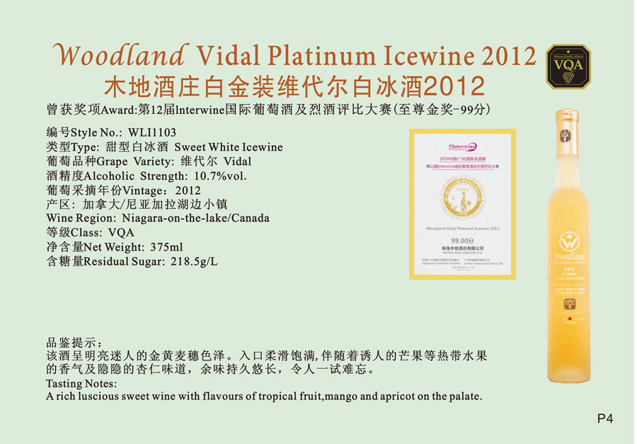 木地酒庄白金装维代尔白冰葡萄酒2012A